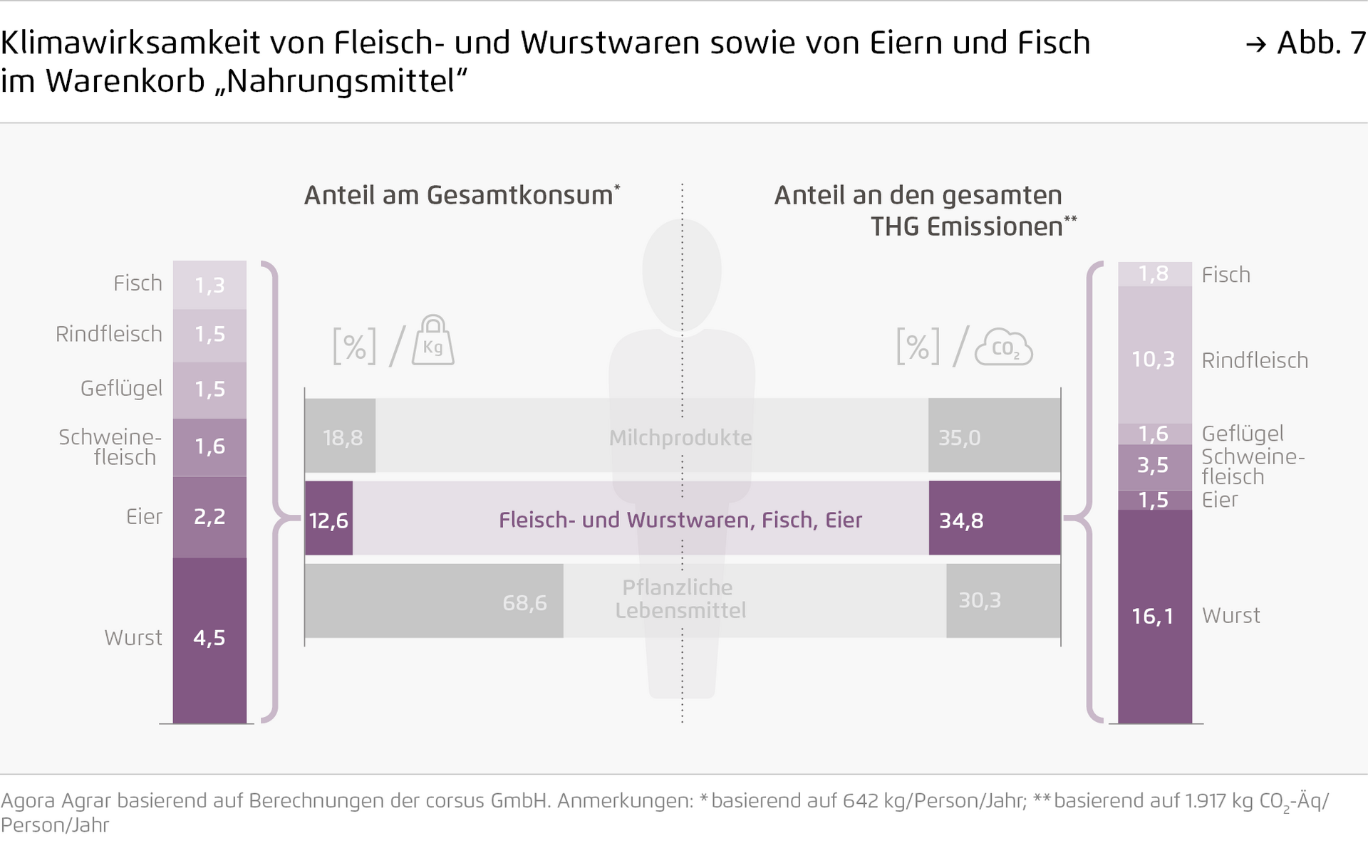 Der Konsum von Fleisch- und Wurstwaren sowie Eiern und Fisch macht einen Anteil von etwa 35 Prozent an den ernährungsbedingten Treibhausgasemissionen aus. Wie bei Milchprodukten sind die relativ hohen Emissionen von Rindfleisch vor allem auf die verdauungsbedingten Methanemissionen der Rinder sowie auf die geringere Futtereffizienz im Vergleich zu Schweinen oder Geflügel zurückzuführen. Fast die Hälfte des Fleischkonsums in Deutschland entfällt auf den Konsum von Wurstwaren, dementsprechend hoch ist auch deren Klimawirksamkeit (Abbildung 7).