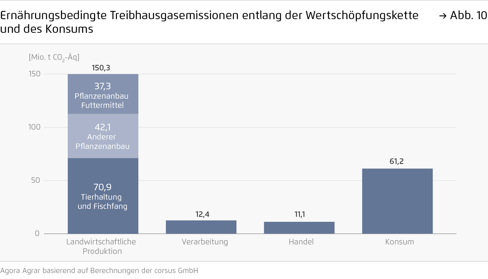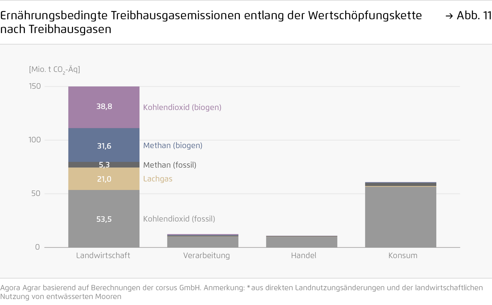 Betrachtet man die unterschiedlichen Phasen der Wertschöpfungskette und den Konsum, so entsteht mit etwa 64 Prozent der mit Abstand größte Anteil der Treibhausgase in der Phase der landwirtschaftlichen Produktion (Abbildung 10). Diese Phase umfasst den Pflanzenanbau und die Tierhaltung. In diese Phase gehören auch die Treibhausgasemissionen, die durch Landnutzungsänderungen und die landwirtschaftliche Nutzung von Mooren sowie die Herstellung von landwirtschaftlichen Betriebsmitteln wie etwa Stickstoffdünger entstehen.