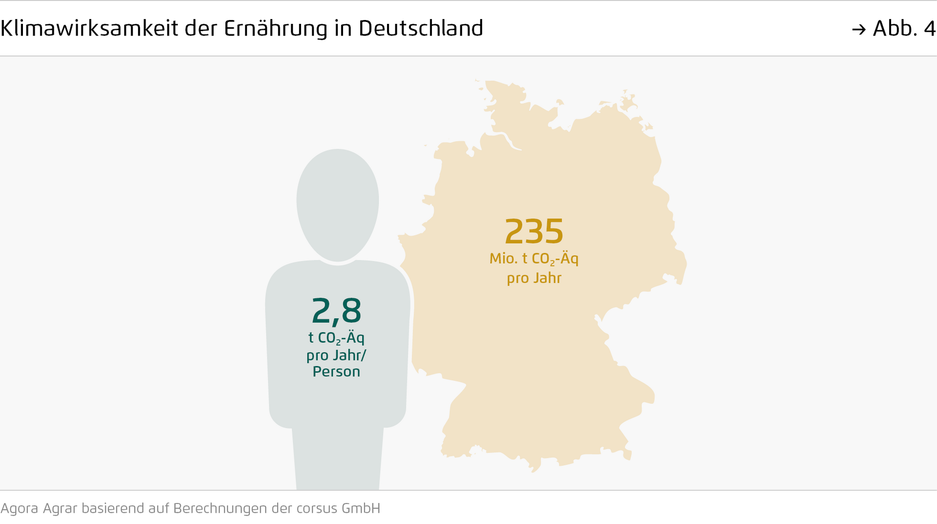 Der Konsum von Lebensmitteln und Getränken in Deutschland verursacht Emissionen von etwa 235 Mio. t CO₂-Äq pro Jahr. Das entspricht etwa einem Viertel der konsumbezogenen Treibhausgasemissionen des Landes (Abbildung 4).