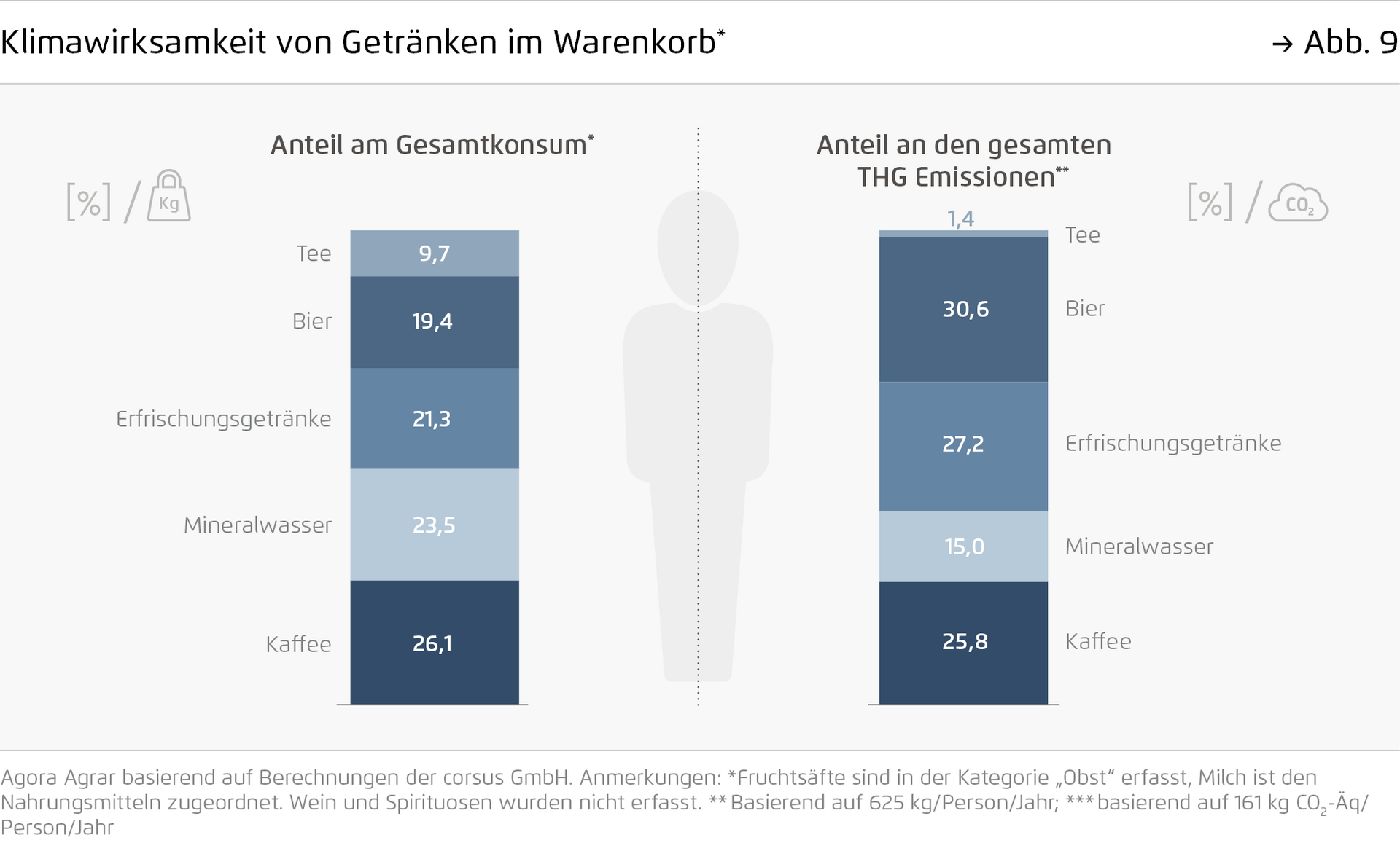 Die vorliegende Studie hat auch die Treibhausgasemissionen aus dem Konsum von Getränken bilanziert. In die Berechnung aufgenommen wurden Mineralwasser, Softgetränke, Bier, Tee und Kaffee (Abbildung 9). Die Klimawirksamkeit der betrachteten Getränke beträgt 13,5 Mio. t CO2-Äq und ist damit im Vergleich mit den Lebensmitteln (173,7 Mio. t CO2-Äq) relativ gering. Der Grund dafür ist, dass Getränke zu einem großen Teil aus Wasser bestehen, dessen Produktion kaum Treibhausgase verursacht. Der Großteil der Emissionen der Getränke entsteht beim Anbau der Rohstoffe, der Weiterverarbeitung sowie bei Lagerung und Kühlung.
