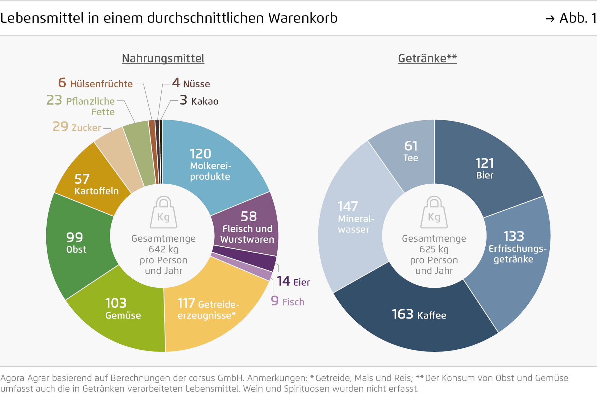 Ausgangspunkt der Analyse ist der durchschnittliche Lebensmittelkonsum in Deutschland pro Jahr und Person, der sogenannte Lebensmittelwarenkorb (Abbildung 1). Insgesamt wurden 58 Lebensmittelgruppen in die Analyse einbezogen. Der Warenkorb umfasst die eingekauften Lebensmittel und Getränke auf der Ebene der Haushalte – unabhängig davon, ob sie verzehrt oder weggeworfen werden. Denn die Nachfrage ist der ausschlaggebende Faktor für die Produktion und die damit zusammenhängenden Umweltauswirkungen.