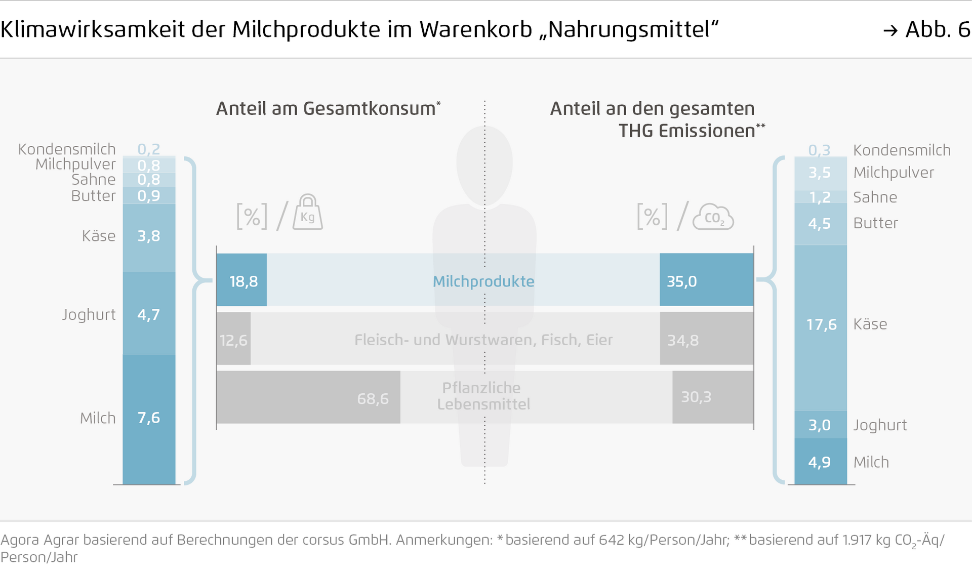 Von den tierischen Produkten ist der Konsum von Milchprodukten mit den anteilig höchsten Treibhausgasemissionen verbunden (Abbildung 6). Die Klimarelevanz von Milchprodukten ist vor allem auf die verdauungsbedingten Methanemissionen der Kühe und die relativ geringe Futtereffizienz zurückzuführen. Von den durchschnittlich konsumierten Milchprodukten hat Käse die höchste Klimawirksamkeit. Das liegt daran, dass für ein Kilogramm Käse viele Liter Milch benötigt werden. Für die Produktion von Hartkäse wie Parmesan wird eine deutlich höhere Menge Milch benötigt als für die Produktion von Frischkäse.