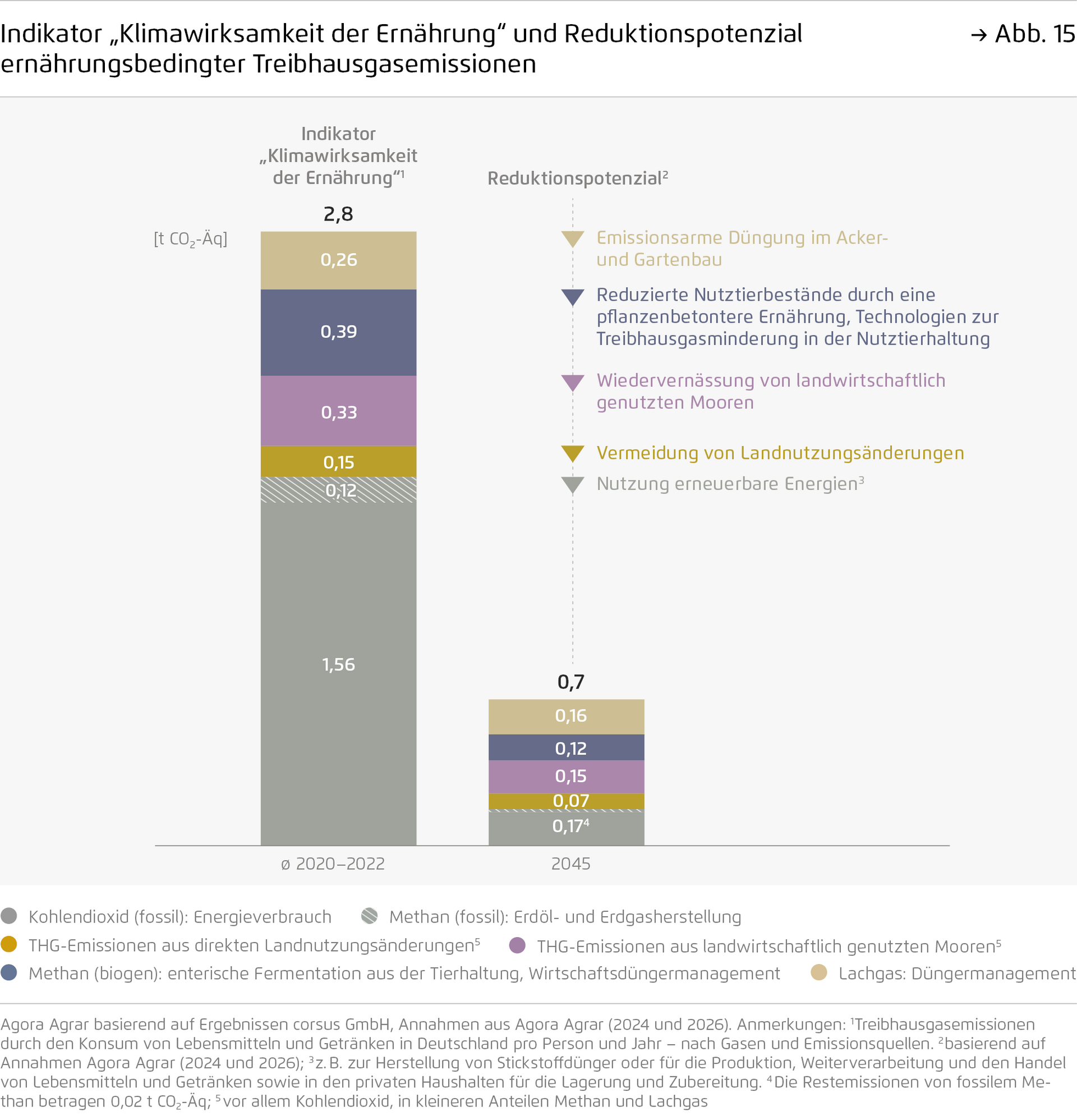 Die Reduktion ernährungsbedingter Emissionen um etwa 80 Prozent gelingt, wenn ernährungs-, agrar- und energiepolitische Maßnahmen ambitioniert umgesetzt werden (Agora Agrar 2026, Agora Agriculture 2024, Agora Think Tanks 2024) und dadurch