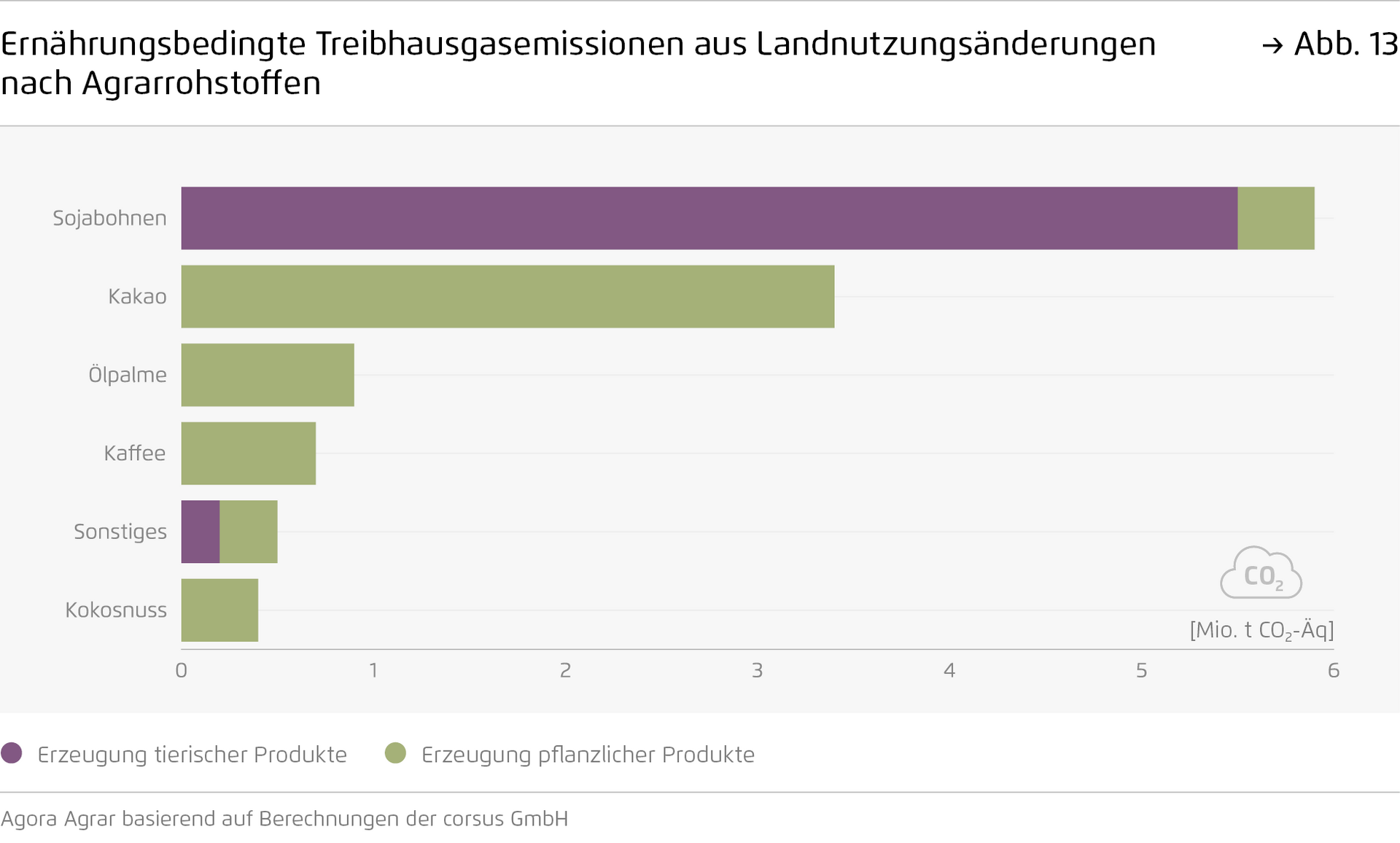 Landnutzungsänderungen, wie etwa die Umwandlung von Wäldern oder Wiesen in landwirtschaftliche Fläche, führen dazu, dass ein Teil des im Boden oder der überirdischen Biomasse gespeicherten Kohlenstoffs als CO2 in die Atmosphäre entlassen wird. Gleichzeitig sinkt die Fähigkeit dieser Flächen, Kohlenstoff zu speichern. Im Durchschnitt entstehen durch diese direkten Landnutzungsänderungen pro Jahr Treibhausgasemissionen in Höhe von etwa 12,3 Mio. t CO2-Äq, maßgeblich außerhalb der EU durch den Anbau von Soja, Kakao, Palmöl und Kaffee (Abbildung 13).