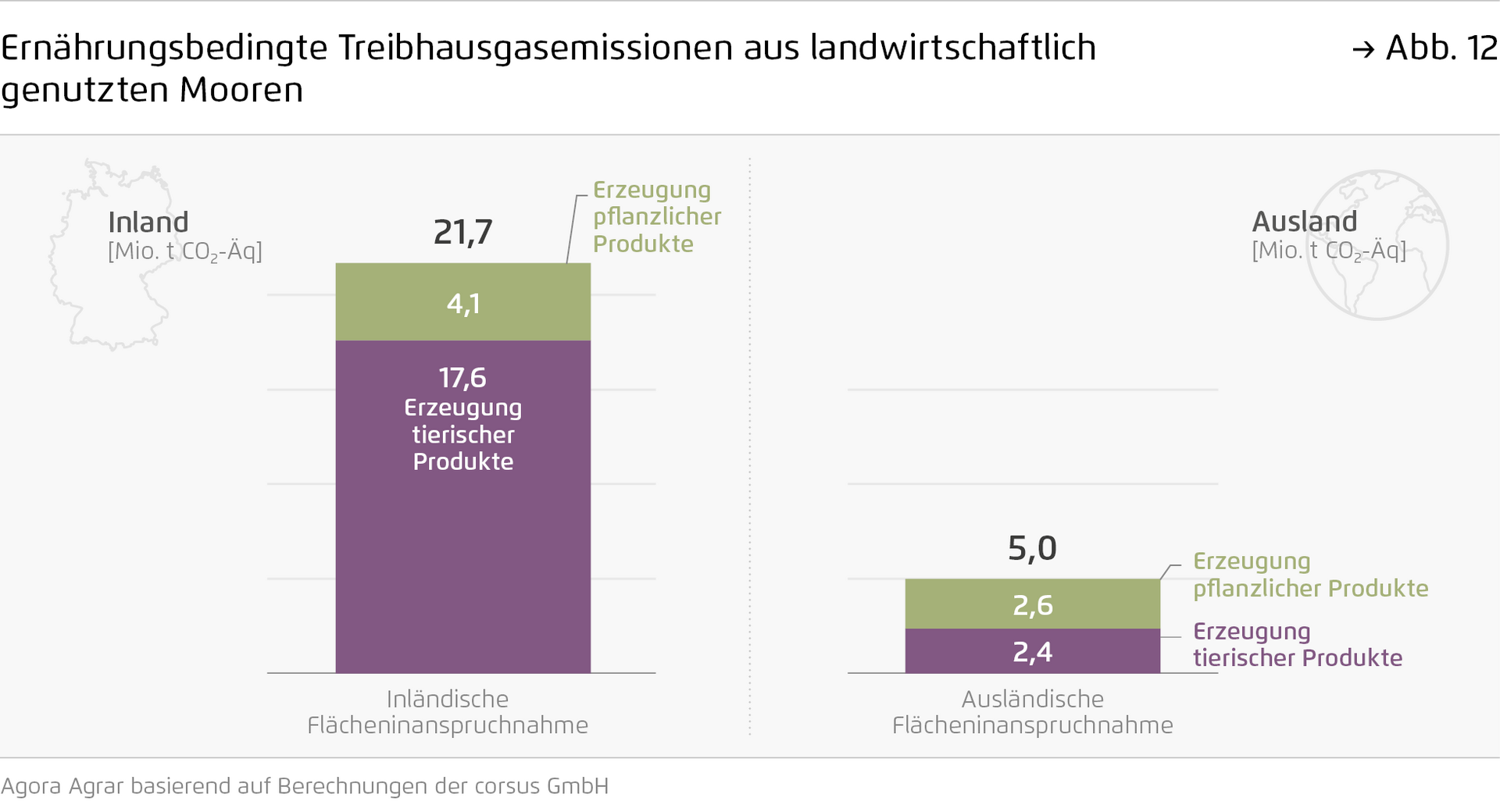 Die Entwässerung von Mooren führt dazu, dass der Kohlenstoff, der in den über Jahrtausende aufgebauten Torfkörpern gespeichert ist, als CO2 in die Atmosphäre abgegeben wird. Für die Erzeugung von Nahrungsmitteln entstehen auf landwirtschaftlich genutzten Mooren jährlich etwa 27 Mio. t CO2-Äq. Der überwiegende Teil dieser Moore liegt in Deutschland und wird für die Produktion von tierischen Lebensmitteln genutzt (Abbildung 12).