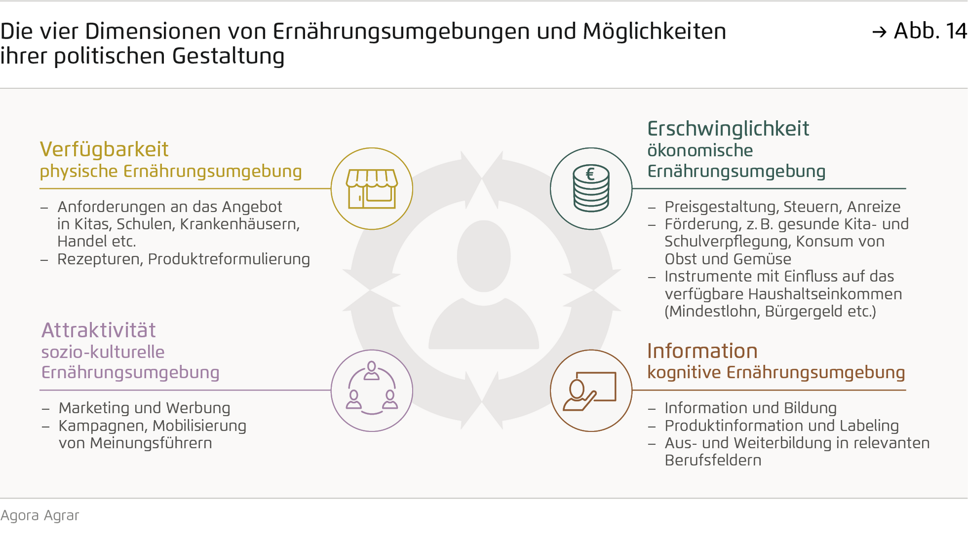 Faire Ernährungsumgebungen (Abbildung 14) sind entscheidend dafür, dass gesunde und nachhaltige Lebensmittel verfügbar, erschwinglich und attraktiv für Verbraucherinnen und Verbraucher sind. Um eine nachhaltigere Ernährung zu fördern, braucht es ein breites Bündel an politischen Maßnahmen, die Gesundheit, Umwelt und soziale Aspekte gemeinsam berücksichtigen. Ebenso wichtig ist eine kontinuierliche Bewertung der Wirksamkeit dieser Maßnahmen, um sie bei Bedarf nachzuschärfen (Agora Agrar 2026, Agora Agriculture 2024, Agora Agriculture & IDDRI 2025).